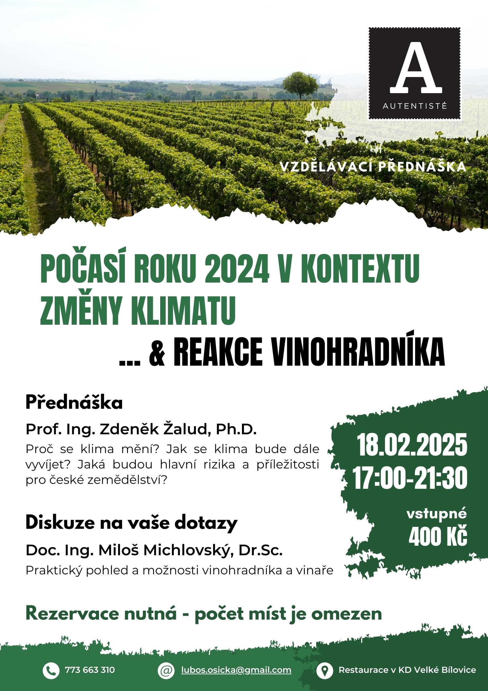 V průběhu přednášky budou postupně zodpovězeny otázky, proč se klima mění, jak se klima bude dále vyvíjet, a jaká budou hlavní rizika a příležitosti pro české zemědělství. Na základě historického vývoje klimatu v ČR a příkladu počasí roku 2024 bude demonstrováno, jak přibývá meteorologických extrémů, a které z nich budou v nadcházejících desetiletích limitovat české zemědělství včetně ovocnářství a vinohradnictví. Klíčová slova přednášky: sucho, vysoké teploty, rozložení srážek a délka vegetačního období. Praktický pohled a možnosti vinohradníka a vinaře - diskuze po přednášce bude založena na Vašich dotazech. Ideální bude, pokud si k tématu alespoň jeden připravíte.